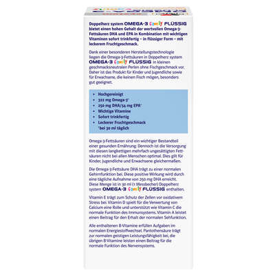 Bietet einen hohen Gehalt der wertvollen Omega3-Fettsäuren DHA und EPA in Kombination mit wichtigen Vitaminen.Doppelherz system Produkte bieten eine sinnvolle, systematisch abgestimmte Kombination verschiedener Nährstoffe – Gesundheit mit System. Dank einer besonderen Herstellungstechnologie liegen die Omega-3-Fettsäuren in Doppelherz system OMEGA-3 FLÜSSIG in kleinen geschmacksneutralen Perlen ohne Fischgeschmack vor. Das Produkt ist daher für Kinder und Jugendliche sowie für Erwachsene, die keinen Fisch mögen, besonders gut geeignet. Doppelherz system OMEGA-3 FLÜSSIG bietet einen hohen Gehalt der wertvollen Omega3-Fettsäuren DHA und EPA in Kombination mit wichtigen Vitaminen sofort trinkfertig – in flüssiger Form – mit leckerem Fruchtgeschmack. Omega-3-Fettsäuren sind ein wichtiger Bestandteil einer gesunden Ernährung. Dennoch ist die Versorgung mit diesen langkettigen mehrfach ungesättigten Fettsäuren nicht bei allen Menschen optimal. Dies gilt für Kinder, Jugendliche und Erwachsene gleichermaßen. Die Omega-3-Fettsäure DHA trägt zu einer normalen Gehirnfunktion bei. Diese positive Wirkung wird durch eine tägliche Aufnahme von 250 mg DHA erreicht. Diese Menge ist in 30 ml (1 Messbecher) Doppelherz system OMEGA-3 FLÜSSIG enthalten. Die wichtigen Vertreter der Omega-3-Fettsäuren sind die Eicosapentaensäure (EPA) und die Docosahexaensäure (DHA), die nicht im Körper ohne Vorstufen gebildet werden können. Aber nur wenige Lebensmittel enthalten diese wertvollen Fettsäuren. Gute Quellen sind fette Kaltwasserfische wie z. B. Makrele, Hering oder Sardinen. Dennoch mag nicht jedes Kind oder jeder Erwachsene mehrmals in der Woche Fisch essen. Mit Doppelherz system OMEGA-3 FLÜSSIG können Kinder und Erwachsene ihre Omega3-Versorgung unterstützen.